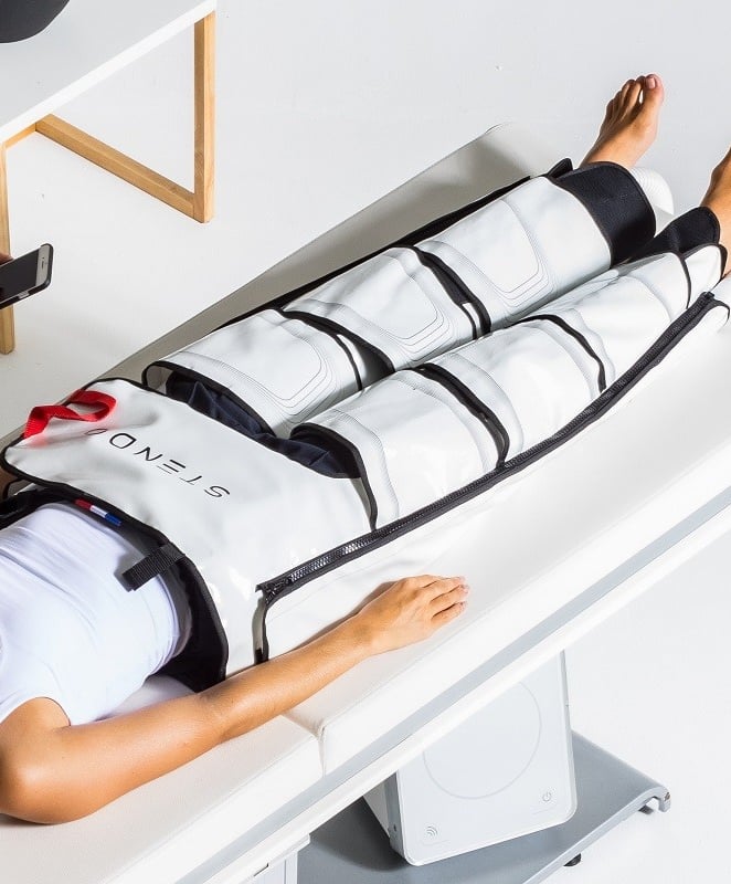Une séance de Pulsothérapie dure entre 20 et 45 minutes, toujours contrôlée par un praticien. Un pulsomètre est posé sur votre doigt pour capter votre rythme cardiaque. La combinaison Stendo ainsi synchronisée, propage des pressions massantes en vagues successives des pieds à l’abdomen.